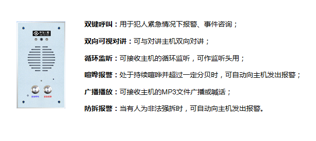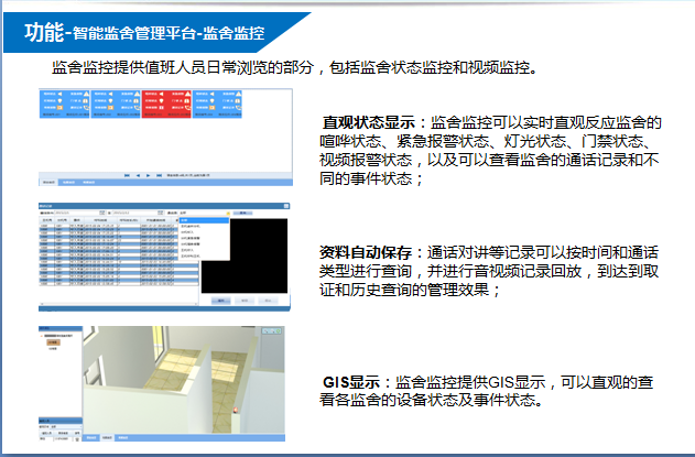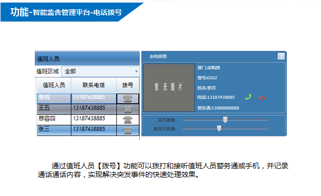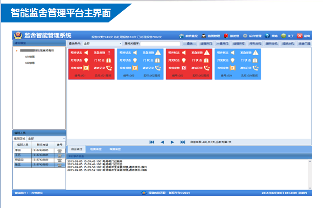? ? ??值班中心接收到報警后,通過智能監舍管理系統自動播放報警區域及報警類型出警調度,提醒值班人員及時處理報警信息;當值班人員超過一定時間未操作智能監舍管理系統時,系統自動采用語音自動播報溫馨提示,提醒值班人員認真履職。