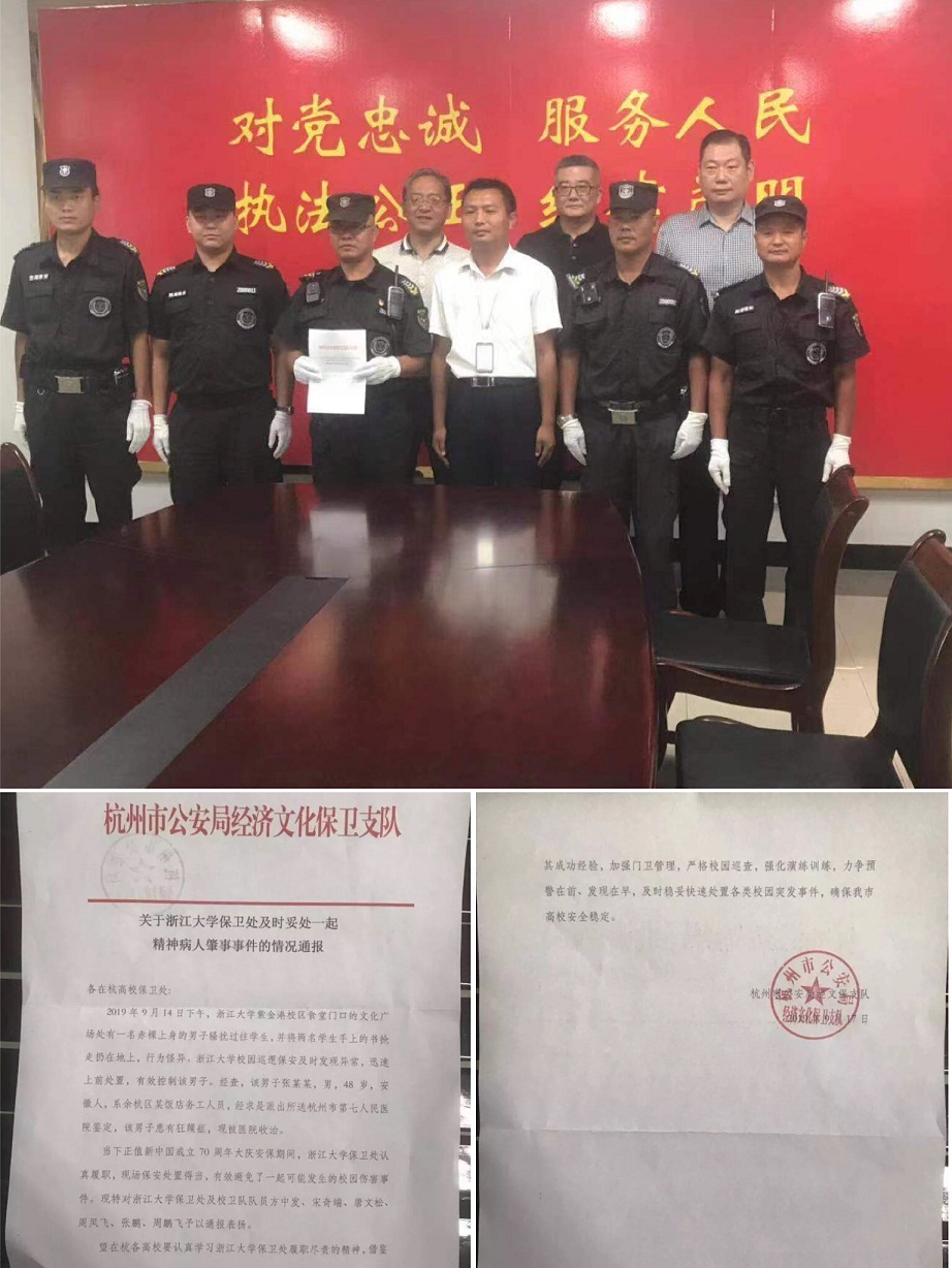 9月14日上午,杭州西湖保安服務公司派駐浙江大學執勤點巡邏隊員發現食堂廣場上有一男子赤裸上身騷擾學生,及時上報學校。班長周鳳飛立即帶領隊員前往處置,將該男子制服后押送求是派出所,經查該男子患有精神疾病。9月23日上午,市公安局經文保支隊馮大隊長專程來到浙江大學,對周鳳飛、張鵬等6名同志進行了通報表揚,值此70周年大慶之際“認真履職,處置得當”,有效避免了一起可能發生的校園傷害事件,將隱患扼殺在苗頭。